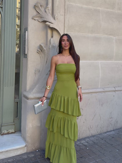 Long dress with strapless neckline. Detail of skirt with flounce and ruffles. It has straps and cups on the chest. Crepe fabric with interlacing in the back to adjust.