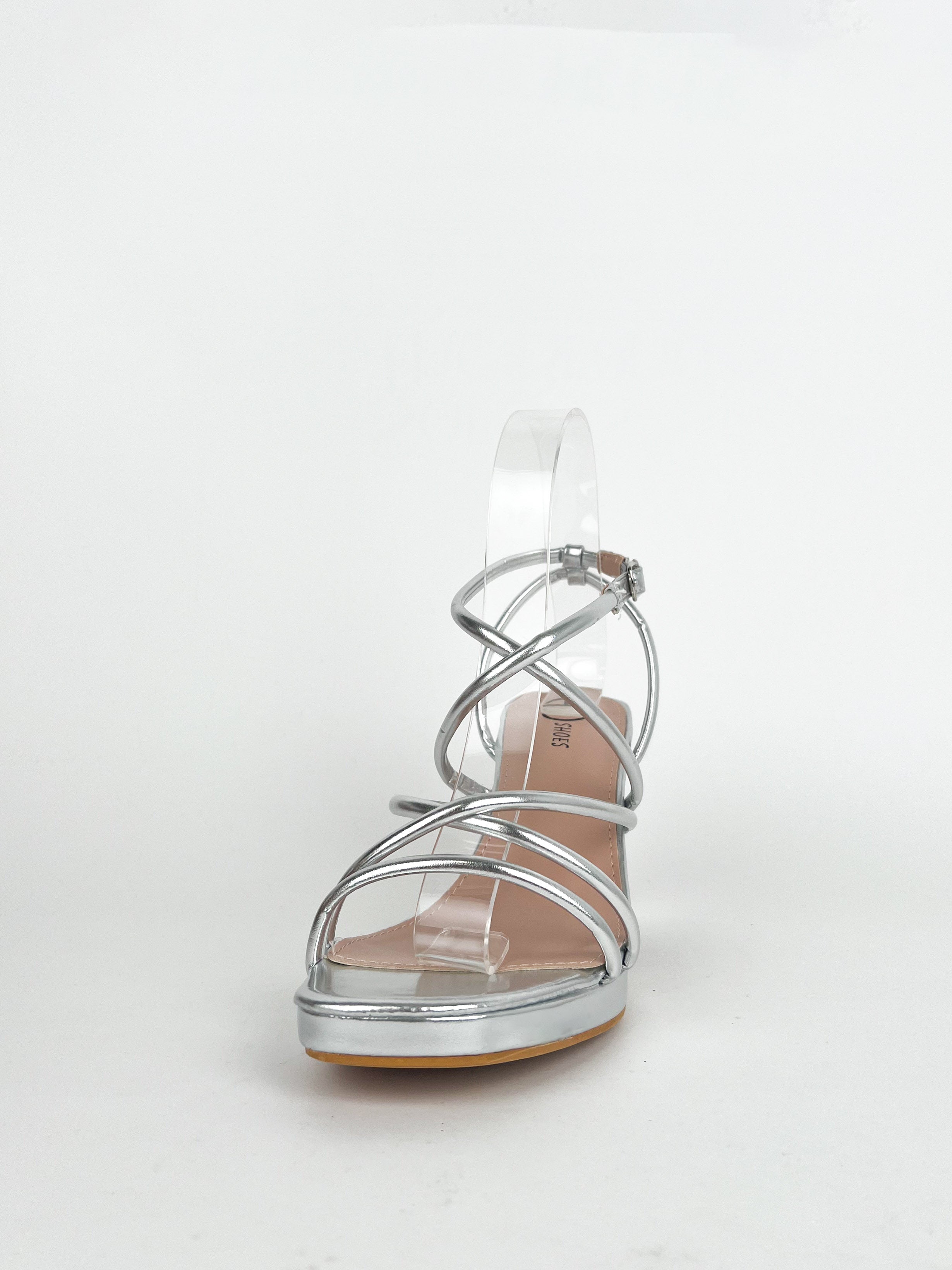 Zapato de tacón alto de color dorado con tiras entrelazadas atado al tobillo con hebilla plateada.