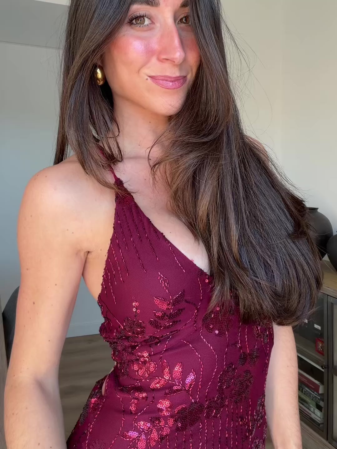 Robe longue avec décolleté en V et bretelles. Elle présente un dos entrelacé et un imprimé floral à paillettes sur l'ensemble de la robe.