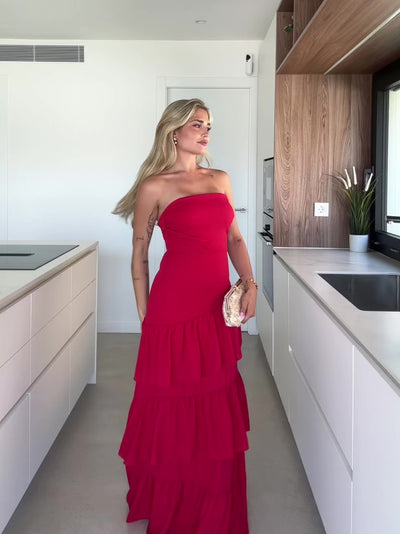 Abito lungo con scollatura senza spalline. Dettaglio della gonna con balza e volant. Ha spalline e coppe sul petto. Tessuto crepe con intreccio sul retro per regolare la vestibilità.