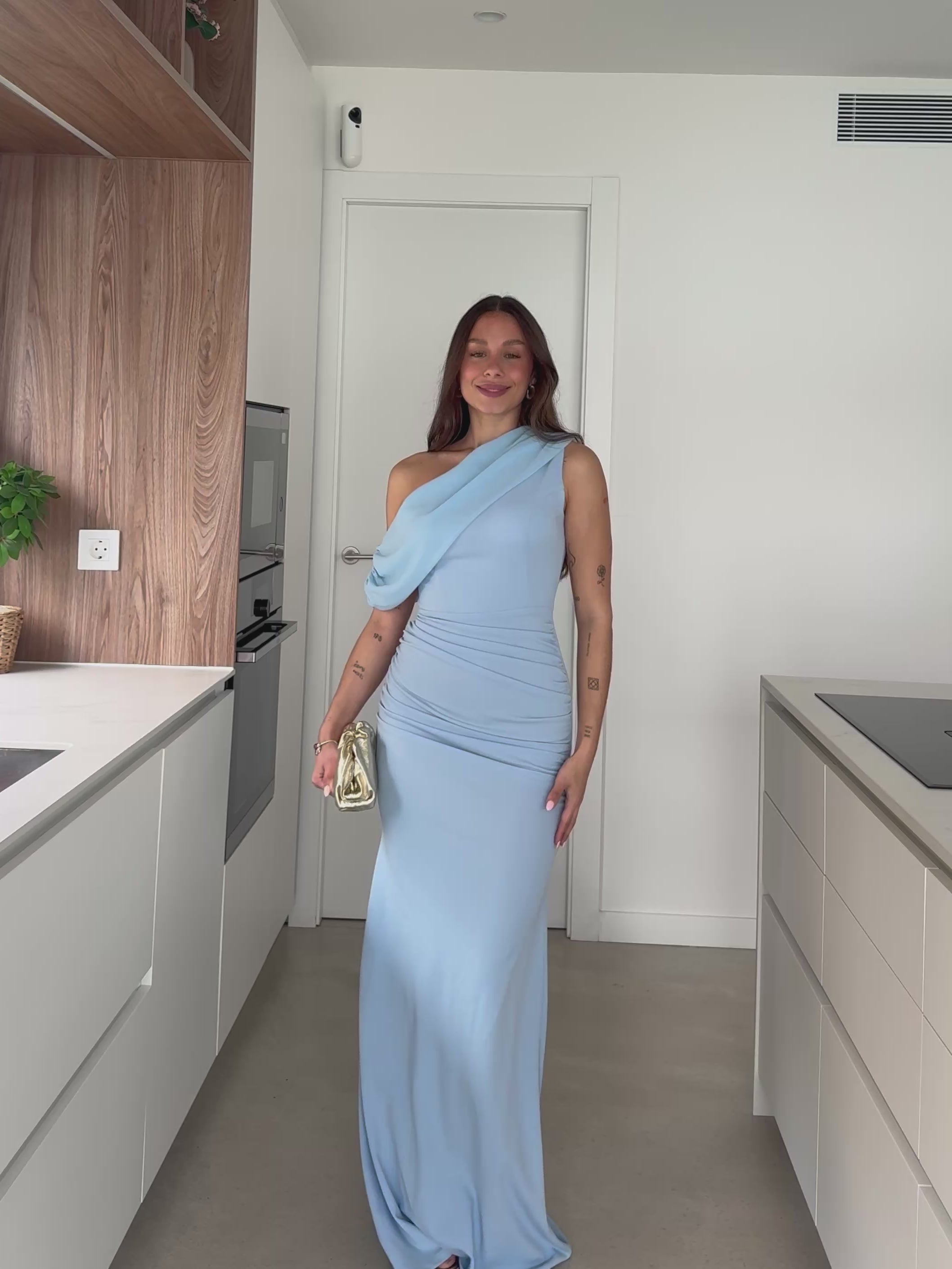 Abito lungo con scollo asimmetrico. Presenta arricciature su un lato del fianco e un dettaglio in tulle sullo scollo.