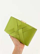 Bolso pequeño de mano satinado color morado. Diseño con tiras entrelazadas. Acabados dorados. Tiene cadena extraíble para llevarlo colgado.