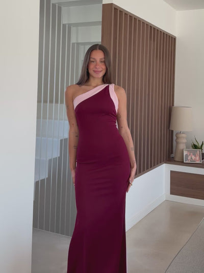 Vestido largo con escote asimétrico. Tiene cierre con cremallera en la espalda y banda de tulle con posibilidad de multiposición.