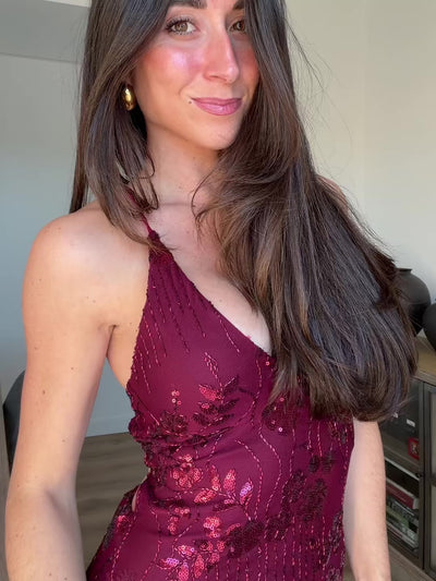 Vestido largo con escote pico y tirantes. Tiene espalda entrelazada y detalle de estampado de flores de lentejuelas por todo el vestido.